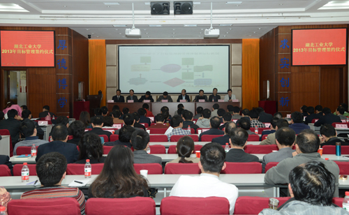 刘德富对2013年学校目标管理工作进行了着重强调,他要求全校师生员工,深刻认识学校面临的形势及任务,切实增强责任感和紧迫感;加强学习、大胆创新,不断提高管理水平;不断改进工作作风,切实提高为教师、学生服务的水平;围绕目标、但不唯目标,一切以有利于学校核心竞争力的提高为最高行为准则;强化团结协作,树立“帮助别人就是帮助自己”的工作思想,注重工作配合,共同为学校内涵建设、实现湖工大的腾飞贡献力量。