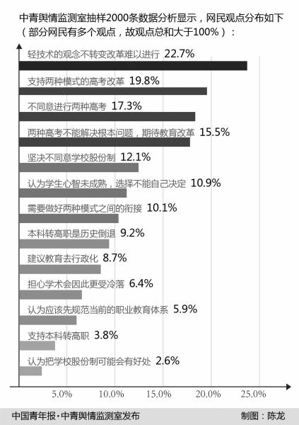 根据中青舆情监测室提供的数据,17.3%的网民不同意进行改革,有10.9%的网友认为,16岁学生心智未成熟,选择不能自己决定。新浪微博网友光未然说,两种模式高考,我并不觉得必须拍案叫好。学生高中就可以选择发展模式,不过金玉其外。16岁的抉择,拼的是父母眼界。