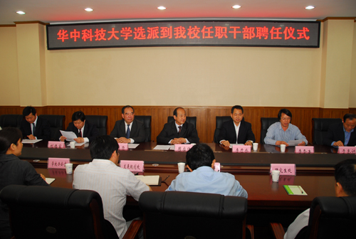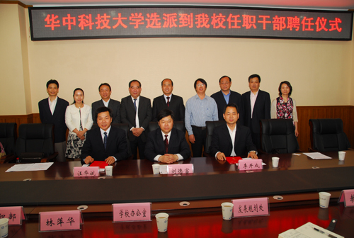 校长刘德富与任职干部签订聘任合同并颁发聘书。林萍华副校长对两校的干部合作予以充分的肯定。他指出,中央部委高校与地方高校对口支持与合作计划是实现部属、省属高校携手发展,提升湖北省高等教育水平而组织实施的一项发展措施,也是武汉城市圈“两型社会”建设规划纲要的一个重要项目。两校之间合作渊源久远,此次选送两位学术水平造诣深的教授来校任学术院长,有利于两校之间更好的交流思想认识,有利于两校之间更进一步的加强交流合作,相信两校之间通过合作交流思想,定会取得新的进步和发展。