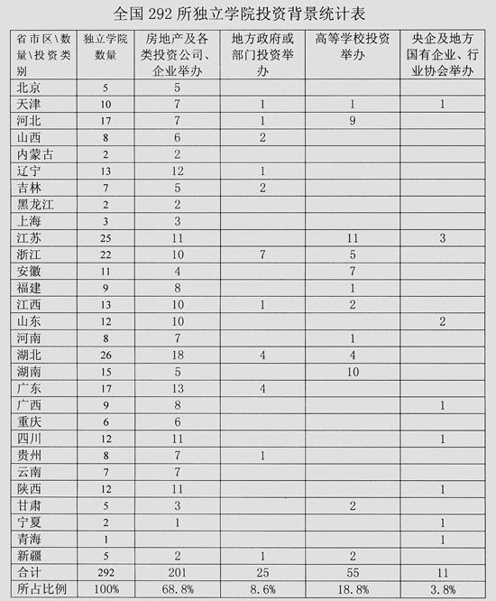 与此同时,北方一家以地产、汽车、教育等领域为投资重点的集团,成为东部、中部及西部地区5所独立学院的投资方;另一家在美国纳斯达克上市的教育产业投资和管理公司则在中部、西部地区投资管理了3所独立学院。